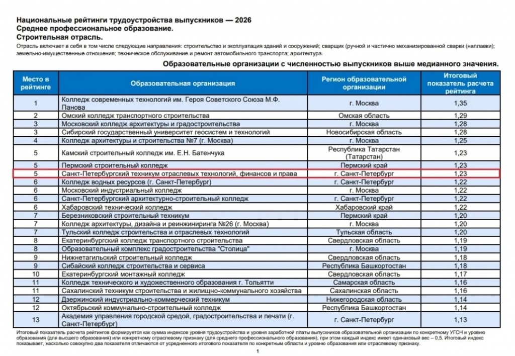 По итогам НАЦИОНАЛЬНОГО РЕЙТИНГА ПО ТРУДОУСТРОЙСТВУ ВЫПУСКНИКОВ в строительной отрасли России наш техникум занял 5 место в стране и 1 место в Санкт-Петербурге.