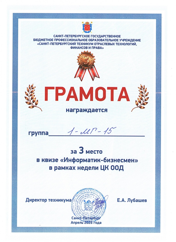 С 30 марта по 4 апреля 2026 года в нашем техникуме прошла предметная неделя цикловой комиссии общеобразовательных дисциплин (ЦК ОД). Одним из событий стал интеллектуальный квиз «Информатик-бизнесмен», организованный преподавателями информатики.