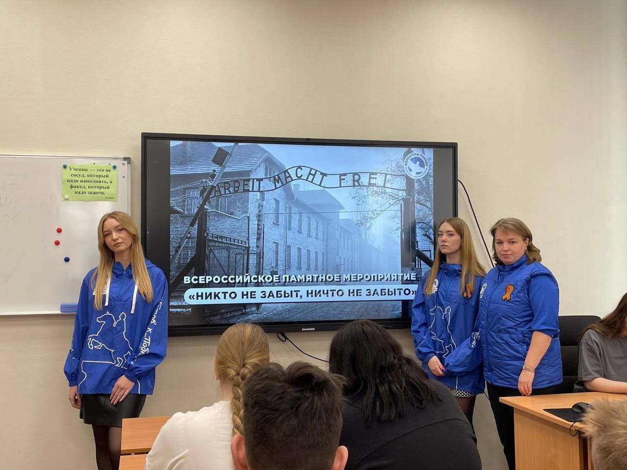 Волонтеры Победы ТОТФиП Дерягина Ангелина, Матросова Алеся, Степанова София, Ужакина Дарья провели Всероссийское памятное мероприятие "Никто не забыт, ничто не забыто". Советский Союз столкнулся со злом, аналога которому не было в истории, и потерял в борьбе с ним почти 27 миллионов человек. Важно помнить об истоках и природе нацизма, чтобы история 80-летней давности не повторилась.<br>